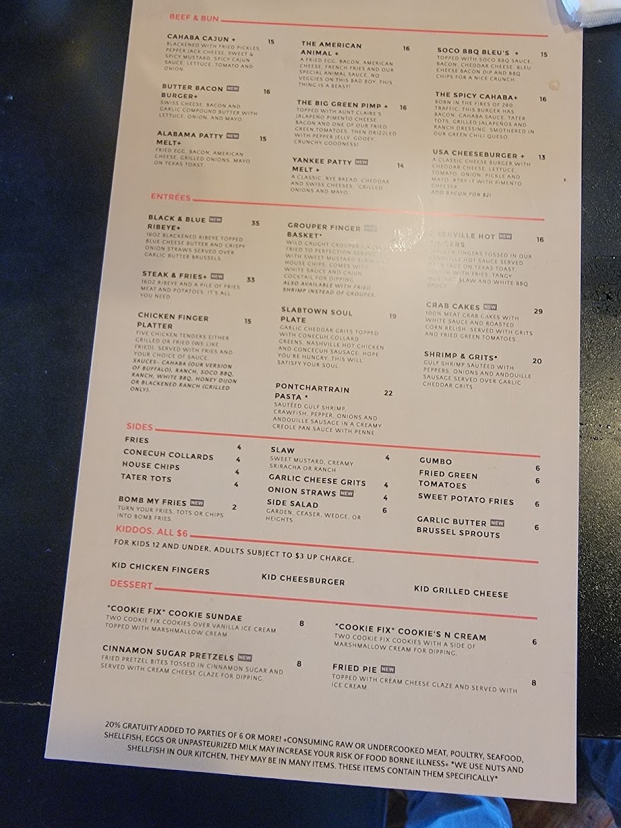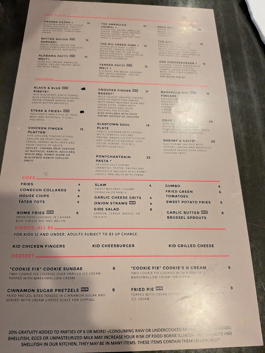 Guests can expect crowd-pleasing dishes like Fried Green Tomatoes and Charleston Shrimp & Grits, alongside indulgent choices such as the Butter Bacon Burger or the Slabtown Soul Plate. Light bites and bar snacks like Queso with Flour Tortilla Chips provide easy options when you're in the mood for sharing or just a quick snack. The menu also embraces fresh seafood and Southern staples, making it a versatile spot for a range of cravings.